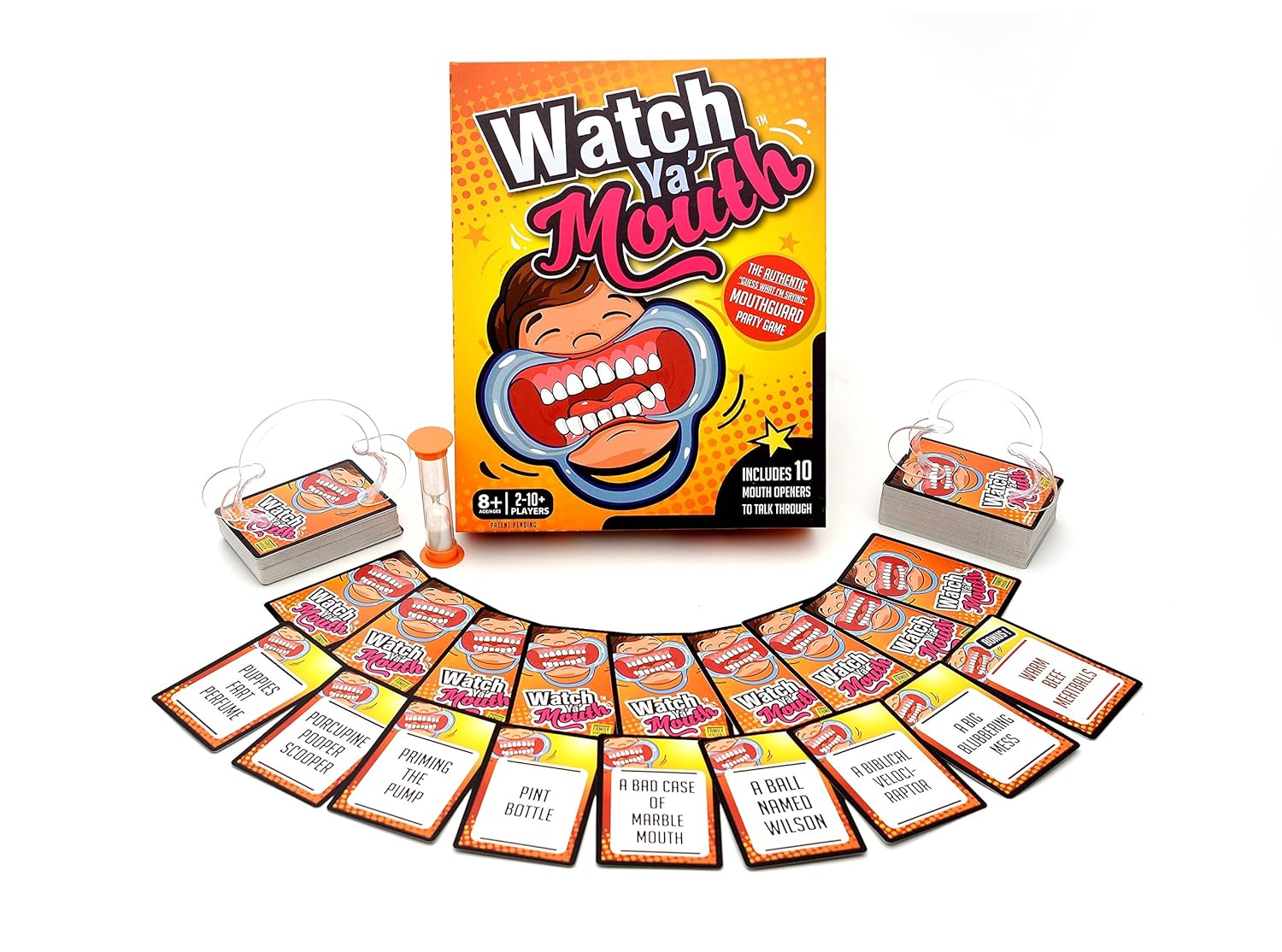 Watch Ya’ Mouth, Hilarious, Mouth guard Party Game. Originated in viral videos, Launched on Kickstarter, and now on Amazon just for you! In this laughter-inducing, competitive card-based game, teams of players, hampered by cheek retractors, attempt to read and interpret/speak out phrases and…. Hilarity ensues! Good for Ages 8+, with virtually unlimited players (when played using our “Alternate” rule set), Watch Ya’ Mouth is a must for any gathering, party, game night, or family night. Our mouthpieces are FDA and CE certified, our cards are thick and durable, and our community is second to none.