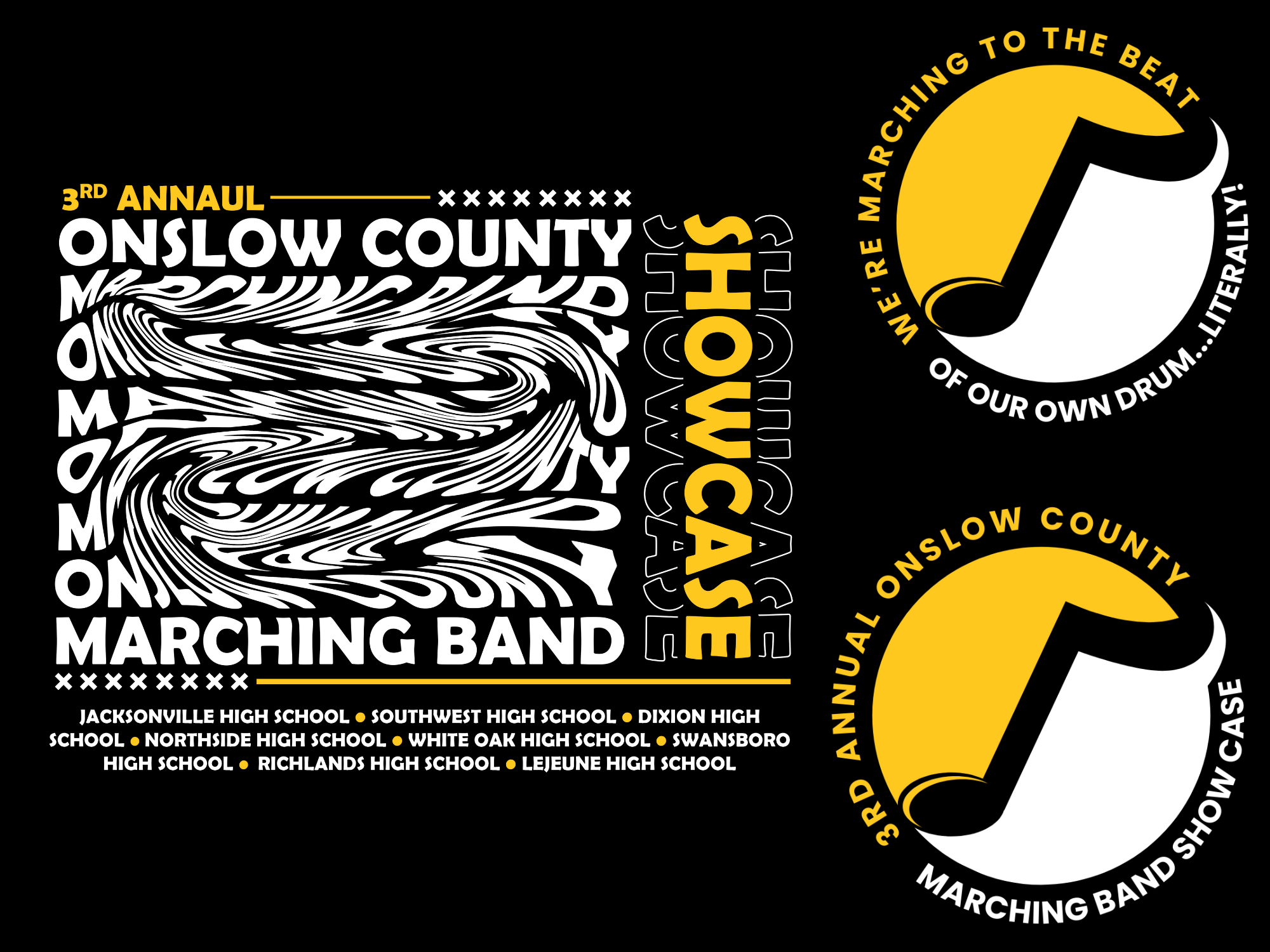 As a designer, the Southwest Onslow High School Marching Band shirts project holds a special place in my heart. Having been a part of the marching band during my high school days, this case study resonates deeply with me. Not only did I meet incredible individuals, some of whom remain close friends to this day, but I also had the privilege of contributing to their journey by designing every shirt for their various themes.