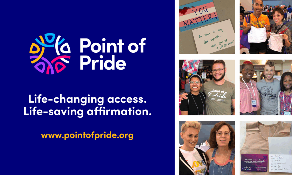Point of Pride provides direct support to transgender and nonbinary individuals who need gender-affirming care but cannot afford it. They offer free chest binders and shapewear, surgery grants, HRT support, and more. Their mission is to remove financial barriers and help people feel safe and confident in their own bodies.